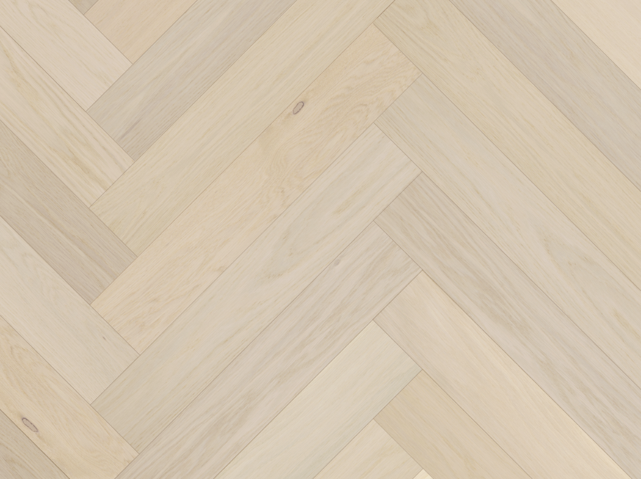Et lyst og klassisk fiskebein gulv i eik med ekstra matt overflate. Den hvite tonen kombinert med lett børsting gir et rent og harmonisk uttrykk.